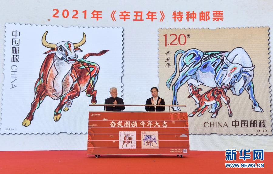 1月5日,《辛丑年》特種郵票設(shè)計(jì)者、藝術(shù)家姚鐘華(左)和中國(guó)郵政集團(tuán)有限公司董事長(zhǎng)劉愛(ài)力在北京的首發(fā)儀式上為《辛丑年》特種郵票揭幕。 當(dāng)日,中國(guó)郵政發(fā)行《辛丑年》特種郵票1套2枚,圖案分別為“奮發(fā)圖強(qiáng)”“牛年大吉”。 新華社記者 李賀 攝 |
