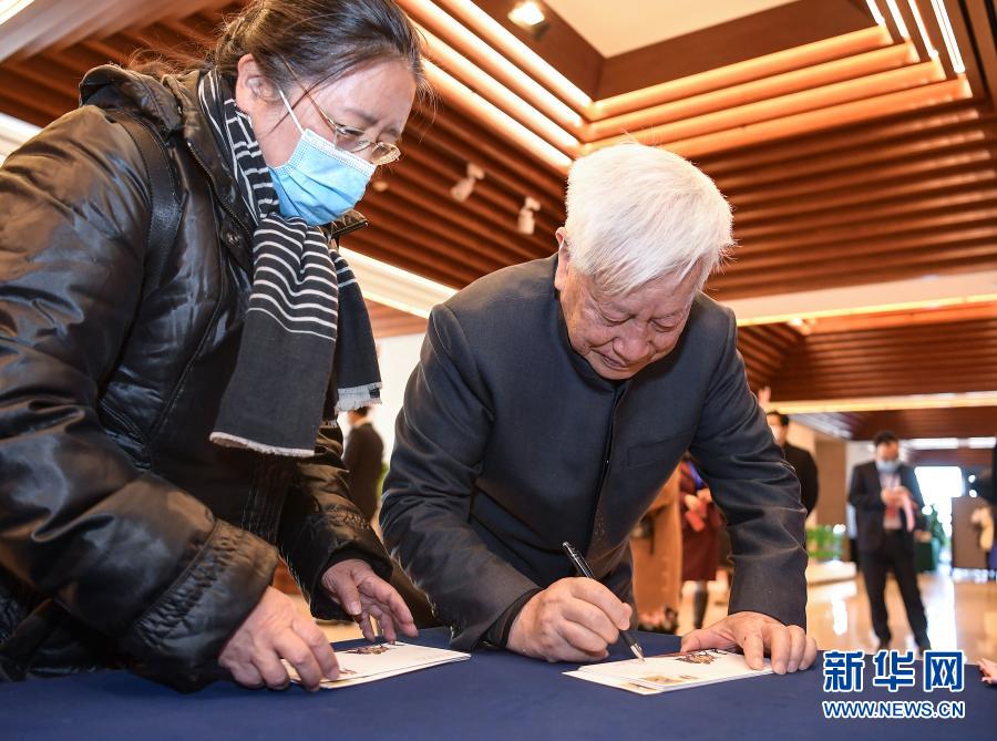 1月5日,《辛丑年》特種郵票設(shè)計(jì)者、藝術(shù)家姚鐘華(右)在北京的首發(fā)儀式現(xiàn)場(chǎng)為集郵愛(ài)好者的《辛丑年》特種郵票首日封簽名。