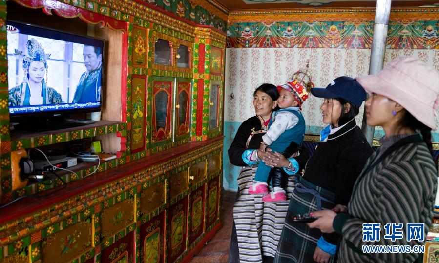 在西藏山南市浪卡子縣普瑪江塘鄉,群眾在家中觀看電視節目(2020年4月15日攝)。