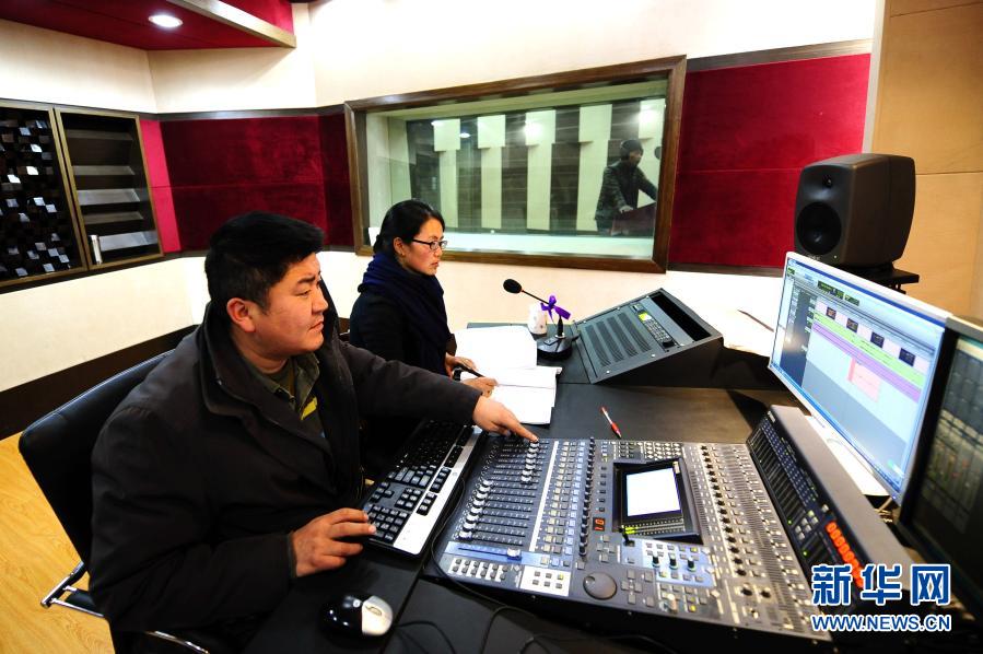在中國西藏廣播電影電視藏語節目譯制中心,工作人員為影片《催眠大師》進行藏語配音(2015年12月11日攝)。新華社記者 晉美多吉 攝