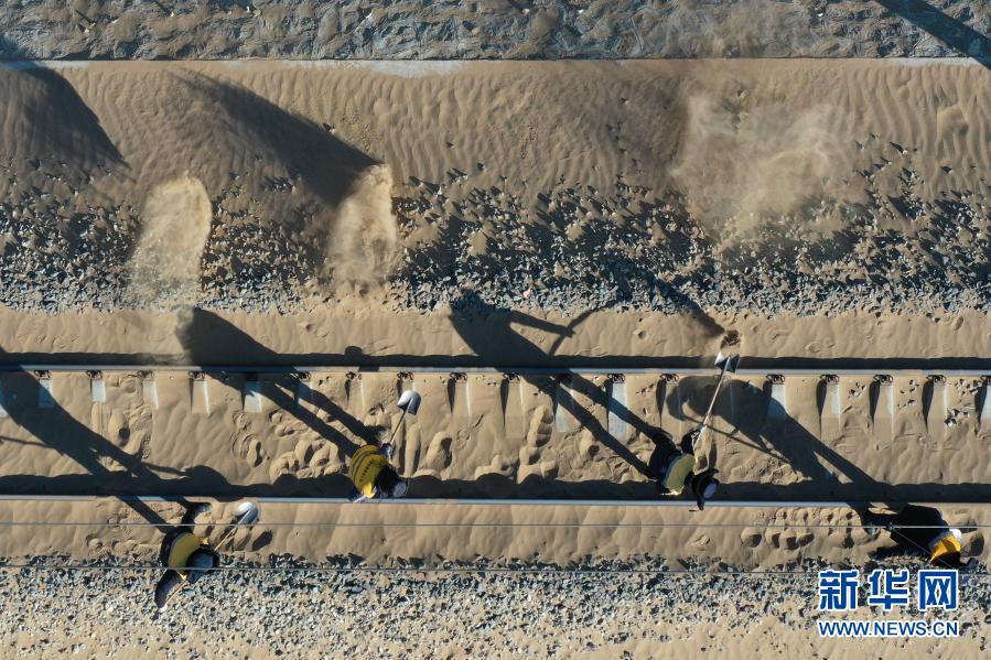 1月12日,“清沙人”在清沙作業中(無人機照片)。新華社記者 杜哲宇 攝
