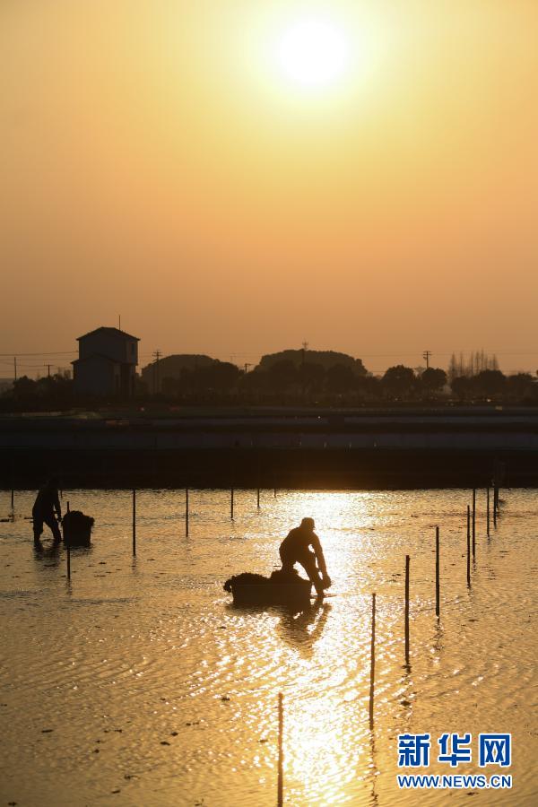 1月19日,在織里鎮恒鑫水產養殖專業合作社的湖蟹養殖基地,蟹農在蟹塘內種植水草。