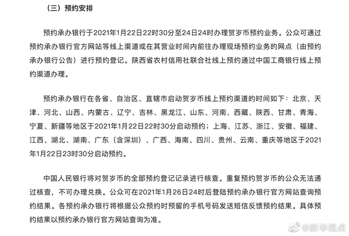 中國人民銀行定于2021年1月29日發行2021年賀歲普通紀念幣一枚,面額為10元,發行數量為1.5億枚,其中預約兌換數量1.4億枚。 2021年賀歲普通紀念幣正面圖案為“10元”字樣等,底紋襯以團花圖案。背面主景圖案為中國傳統剪紙藝術與裝飾年畫元素相結合的一頭抬頭牛造型,襯景圖案為花燈和五谷,幣面左側刊“辛丑”字樣。 賀歲幣每人預約、兌換限額為20枚。預約承辦銀行將于2021年1月22日22時30分至24日24時辦理賀歲幣預約業務。不過,不同地區預約承辦的銀行有所不同,啟動預約的時間也不一樣,需要提前查詢好喲。 喜歡這頭“抬頭牛”的小伙伴趕緊定好鬧鈴,準備搶“牛”吧!(記者吳雨)