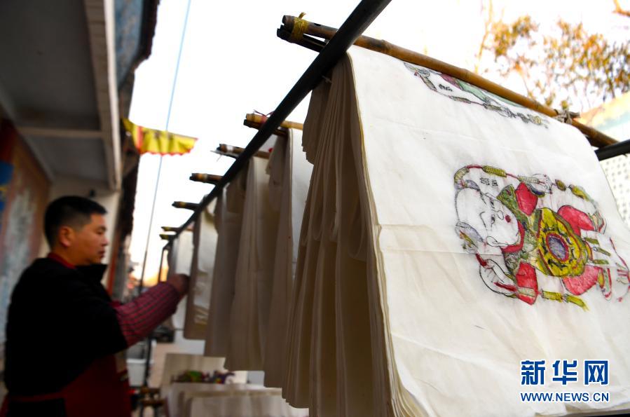 1月19日,開封市朱仙鎮(zhèn)的年畫藝人在晾曬木版年畫。