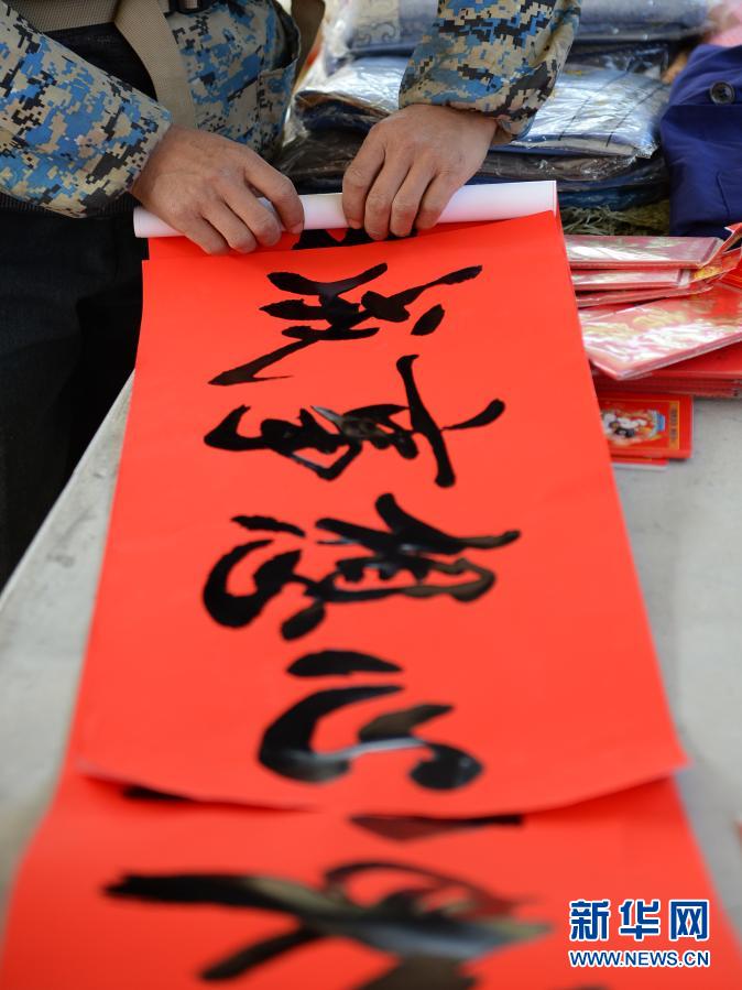 2月6日,在平樂村墟場,商家將村民選好的對聯卷好。新華社記者 陳振海 攝