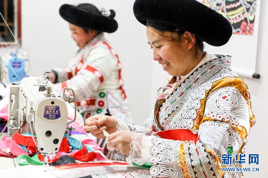 2月3日,畢節市黔西縣新仁苗族鄉化屋村村民在扶貧車間內加工衣服。