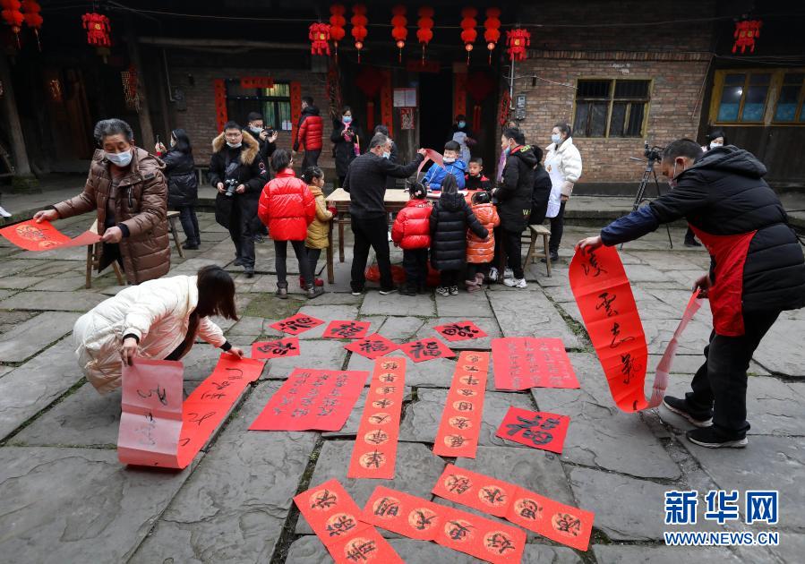 2月4日,花灘鎮(zhèn)上的書(shū)法名師石華熔、李幫榮兩位老先生在為村民寫(xiě)春聯(lián)。新華社記者 江宏景 攝