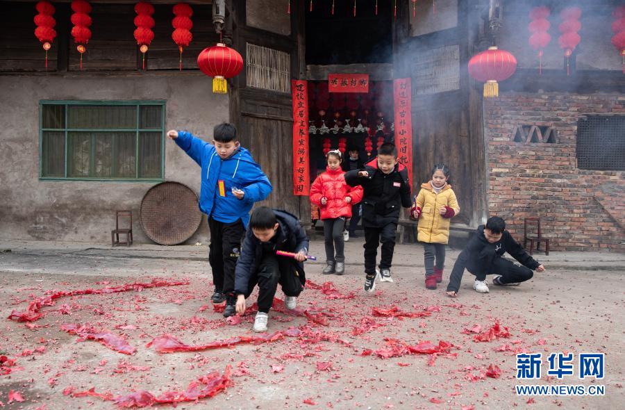 2月4日,孩子們在李家大院門口撿拾未放完的炮仗。新華社記者 江宏景 攝