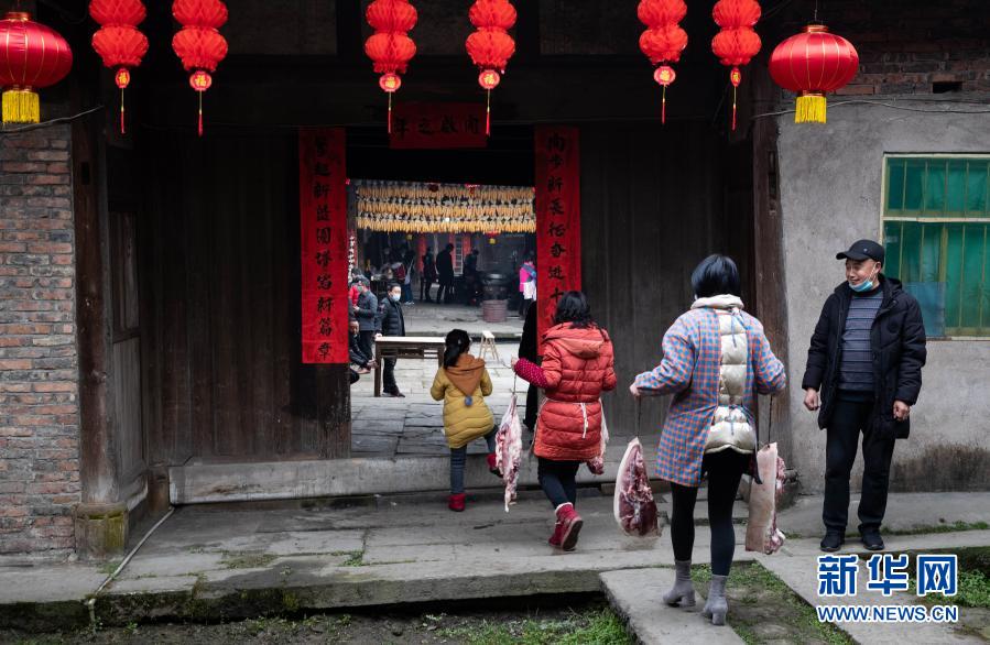 2月4日,李家大院的居民提著鮮肉準備做“殺豬菜”。新華社記者 江宏景 攝