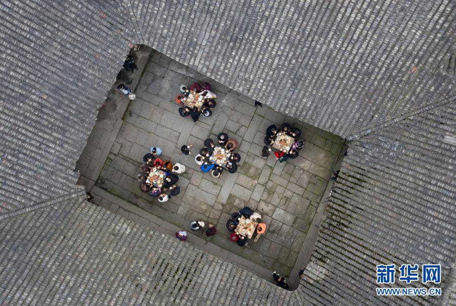 2月4日,李家大院的居民在吃“小年”團年飯(無人機照片)。新華社記者 江宏景 攝
