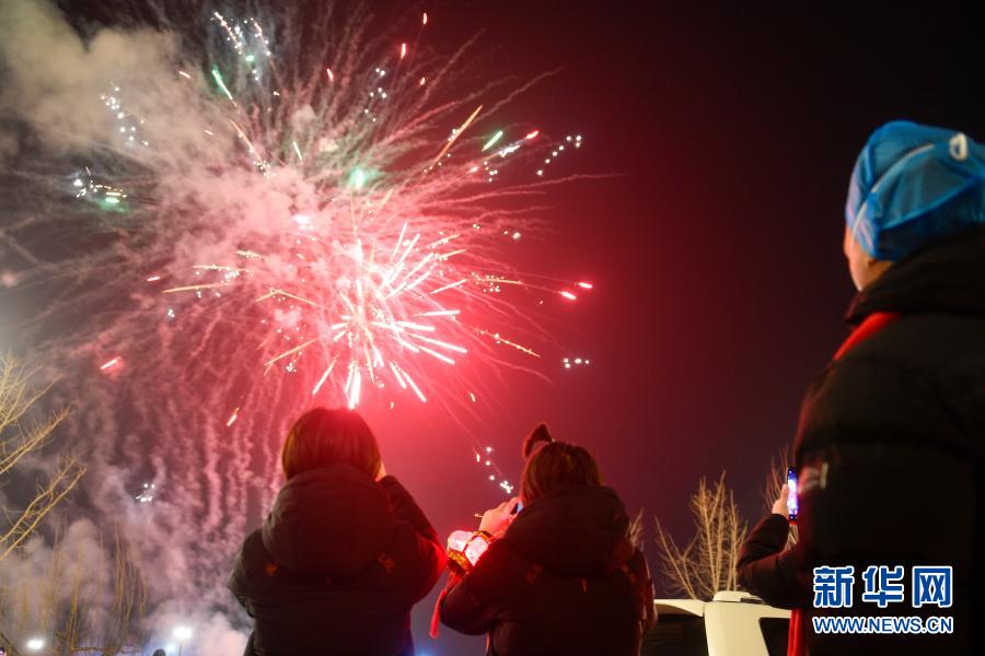 2月12日,在吉林省通化市醫(yī)護(hù)人員駐地,醫(yī)護(hù)人員觀看煙花表演。