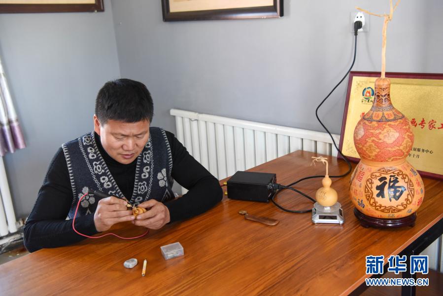 在霍爾果斯市加爾蘇村的烙畫工作室,曹光耀在創(chuàng)作葫蘆烙畫(2月6日攝)。新華社記者 丁磊 攝