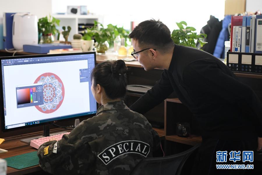 馬成虎(右)和同事一起設計敦煌元素文創產品(1月14日攝)。新華社記者 陳斌 攝