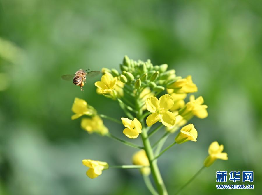 2月19日,在福建省福州市閩清縣白中鎮珠中村,蜜蜂在油菜花旁飛舞。新華社記者 宋為偉 攝