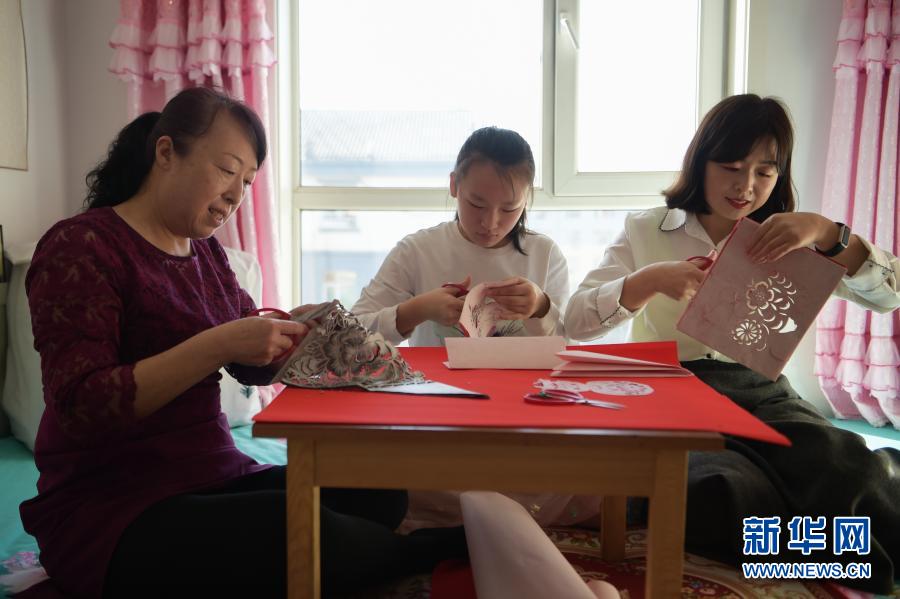 2月21日,在烏海市海南區(qū)新橋花園,李華(左)與外孫女高宇晨(中)、大女兒譚紅葉一起在家中剪紙。新華社記者 李志鵬 攝