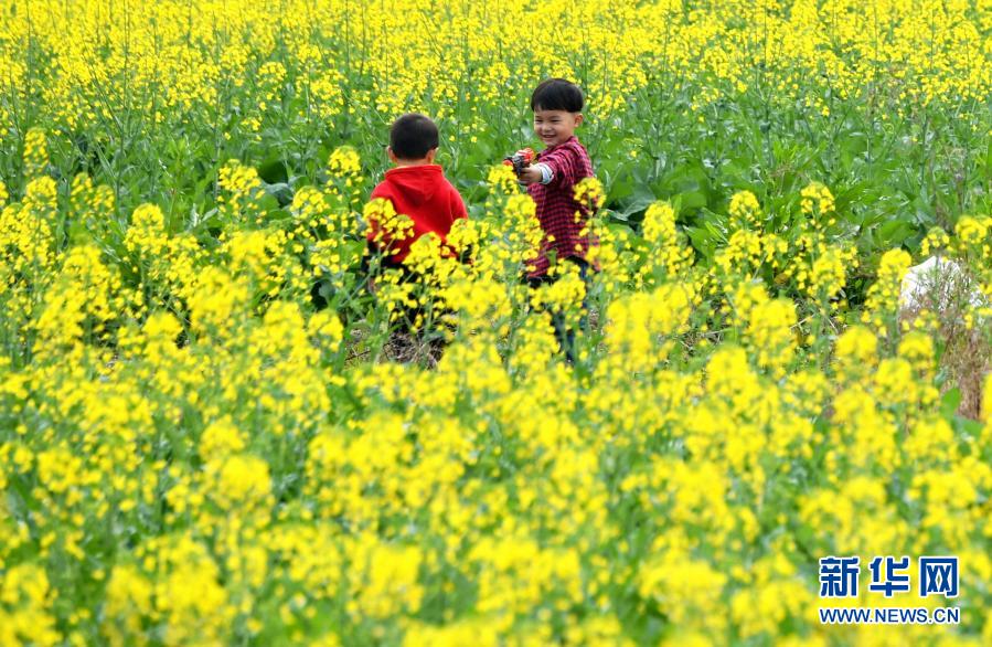 2月23日,在閩侯縣鴻尾鄉鴻尾村的油菜花種植示范基地,兩名小朋友在油菜花田里玩耍。新華社記者 魏培全 攝