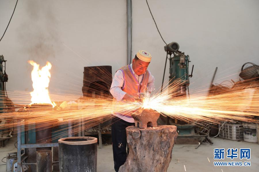 2月24日,在甘肅省臨夏回族自治州積石山縣大河家鎮(zhèn)的甘肅省非遺扶貧就業(yè)工坊,國家級非物質文化遺產代表性項目保安族腰刀鍛制技藝傳承人馬尕主麻在打制保安腰刀。新華社記者 馬莎 攝