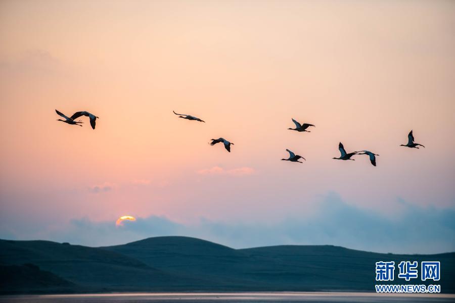 黑頸鶴在大山包大海子濕地飛翔、覓食(2月25日攝)。新華社記者 胡超 攝