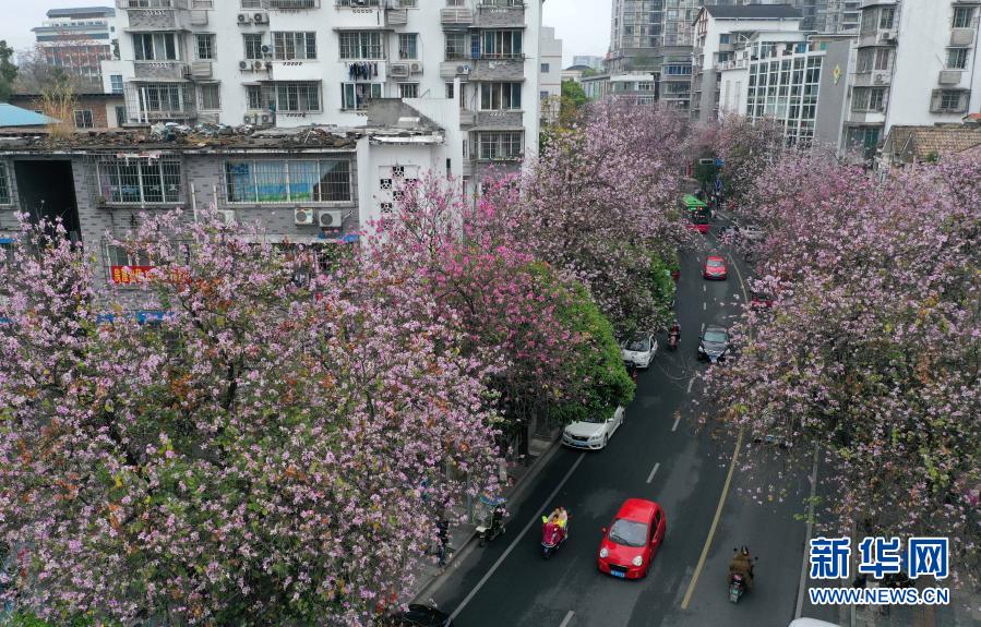 近日,廣西柳州市洋紫荊陸續盛開,市區近百條街道和多個公園、小區逐漸變成花的海洋。洋紫荊是柳州市市花,柳州市區共種植洋紫荊28萬株。