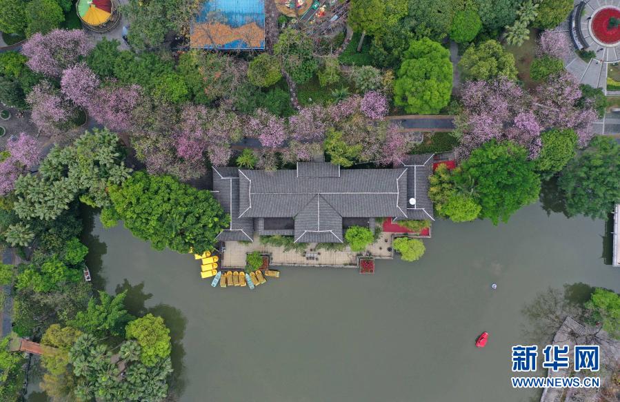 這是洋紫荊盛開的柳州市柳侯公園(無人機照片,2月28日攝)。