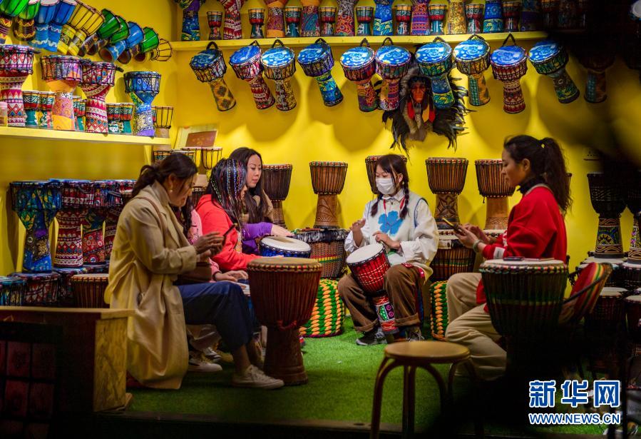 3月3日,游客在大理古城內(nèi)體驗(yàn)打手鼓。