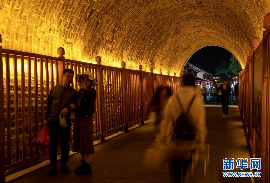 夜幕下的大理古城燈火璀璨,舒適的氣候、美麗的景色和獨特的建筑風貌等吸引各地游客匯集于此感受古城魅力。
