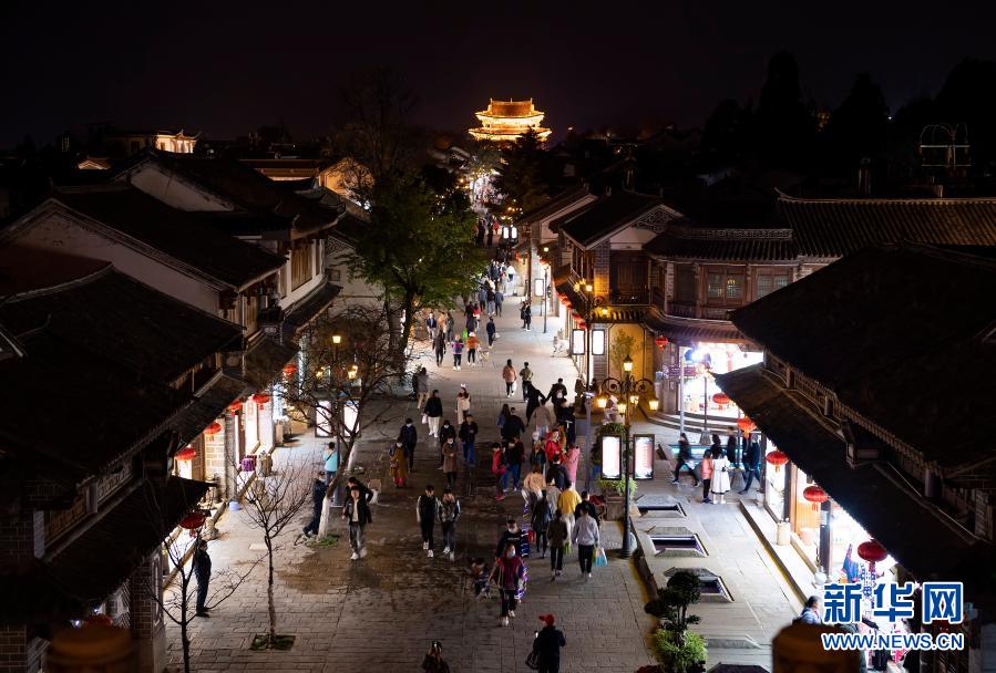 夜幕下的大理古城燈火璀璨,舒適的氣候、美麗的景色和獨特的建筑風貌等吸引各地游客匯集于此感受古城魅力。