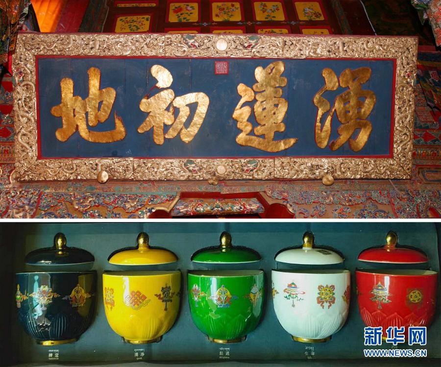 拼版照片:上圖為懸掛于布達拉宮西大殿正中上方、乾隆賜予八世達賴喇嘛的御筆金字匾額“涌蓮初地”;下圖為布達拉宮紅山腳下文創體驗店內的“蓮花五蘊杯”文創瓷器(1月26日攝)。新華社記者 孫非 攝 布達拉宮紅山腳下文創體驗店內,一款“蓮花五蘊杯”文創瓷器,以一種全新的方式續寫了漢藏民族自古一脈相承的歷史文化。文創店工作人員巴桑玉珍介紹,其創作靈感源自懸掛于布達拉宮西大殿正中上方、乾隆賜予八世達賴喇嘛的御筆金字匾額“涌蓮初地”。西藏自治區博物館文創店仿制乾隆藏品青花陶文福壽三多瓷器套裝則由景德鎮匠人用傳統工藝燒制,一經上架便搶購一空。 周華勇店里的景瓷以茶杯、碗、碟為主,還有花瓶、禮佛瓷器等。他的生意,已翻越喜馬拉雅山脈,走進了尼泊爾、印度客戶家中。 “我是生意人,也是新時代的文化使者,我既推廣瓷文化,更見證和推動中華民族交往交流交融。”他說。