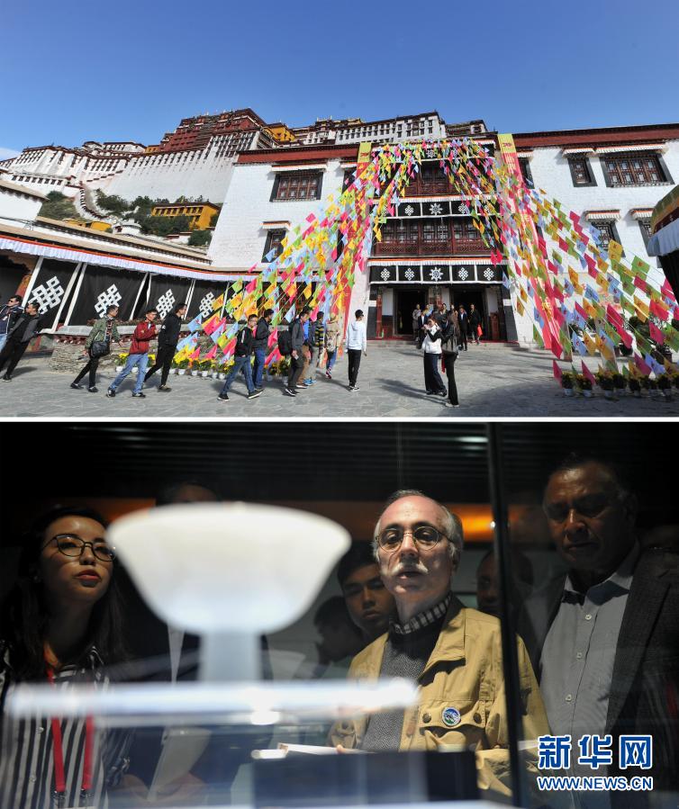 拼版照片:上圖為布達拉宮珍寶館文物展出現場(2019年10月5日攝),下圖為參觀者在觀看布達拉宮精品文物展上展出的瓷器(2016年9月12日攝)。新華社記者 晉美多吉 攝