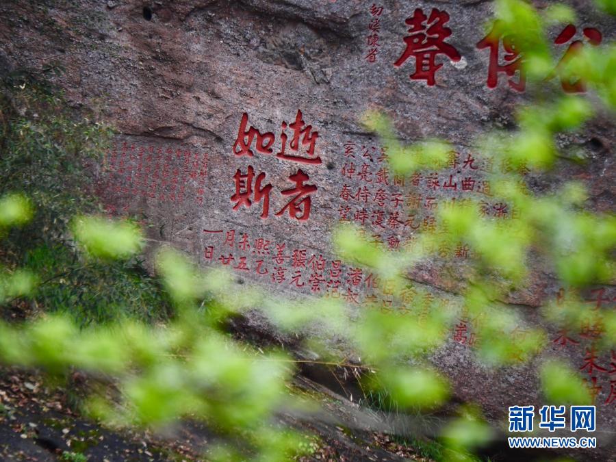 3月21日,武夷山國家公園九曲溪畔丹霞巖壁上的摩崖石刻與綠樹相映成趣。新華社記者 姜克紅 攝