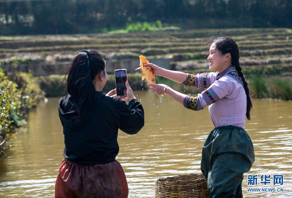 一名農(nóng)民在新街鎮(zhèn)大魚塘村梯田犁田(2月25日攝)。新華社記者 陳欣波 攝 云上的時尚 “我給你們抓魚吧!”24歲的哈尼族姑娘丁繼楠在快手上直播大魚塘村梯田場景。這是她傳播哈尼族民俗與文化系列直播中的一場,吸引眾多粉絲點贊。 前幾年,丁繼楠辭掉工作,回村組建團隊。她取了個網(wǎng)名“梯田上的蘭子”,網(wǎng)友稱她“蘭子”。2019年3月,團隊在直播平臺上傳首個視頻:蘭子身著哈尼族服飾,向網(wǎng)友展示哈尼族美食——馬刺花粑粑的制作過程。 采春茶、捉稻田魚……向網(wǎng)友展現(xiàn)哈尼人生活的視頻得到網(wǎng)民喜歡。1個月后,視頻獲得大量點贊。現(xiàn)在,在網(wǎng)絡(luò)上擁有很多粉絲的蘭子成為哈尼梯田的“代言人”,也成為新時代元素融入梯田的代表。