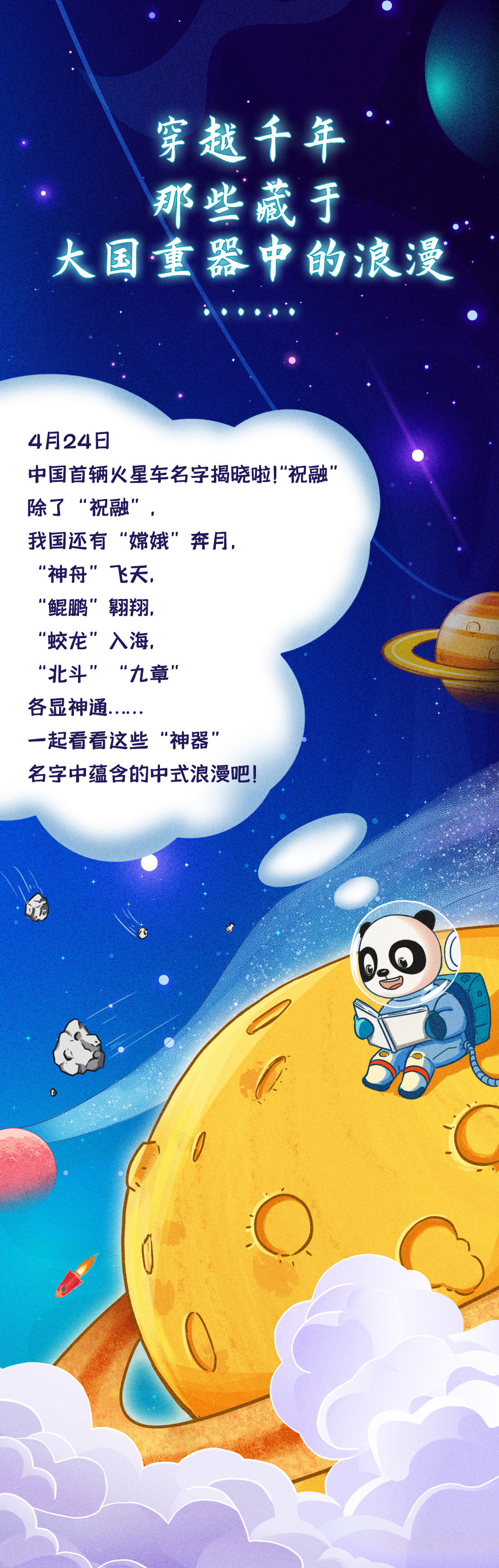4月24日,中國首輛火星車全球征名結果揭曉,定名為“祝融”。 近年來,中國硬核科技越來越搶眼,引全球關注。“嫦娥”奔月,“神舟”飛天,“鯤鵬”翱翔,“蛟龍”入海,“北斗”“九章”各顯神通…… 這一個個國之“神器”不但意義非凡,它們的命名還蘊藏著“中國式浪漫”。 一圖細數這些讓世界矚目的國之“神器”,get屬于中華文化的硬核浪漫。