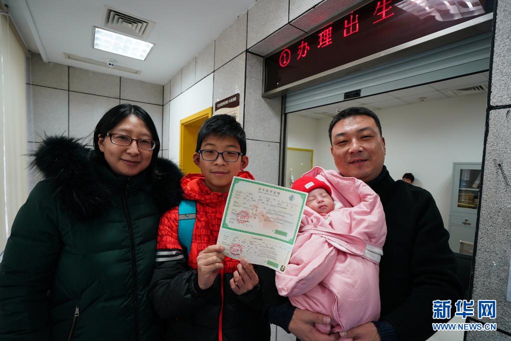 2019年1月1日,在南京市婦幼保健院,為二胎寶寶領取新版出生醫學證明的顧先生一家四口合影留念。新華社記者 季春鵬 攝