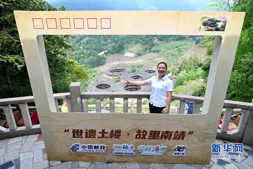 5月19日,在福建漳州市南靖縣田螺坑土樓群觀景臺(tái),參觀者在《福建土樓》特種郵票發(fā)行活動(dòng)現(xiàn)場(chǎng)拍照留念。新華社記者 林善傳 攝