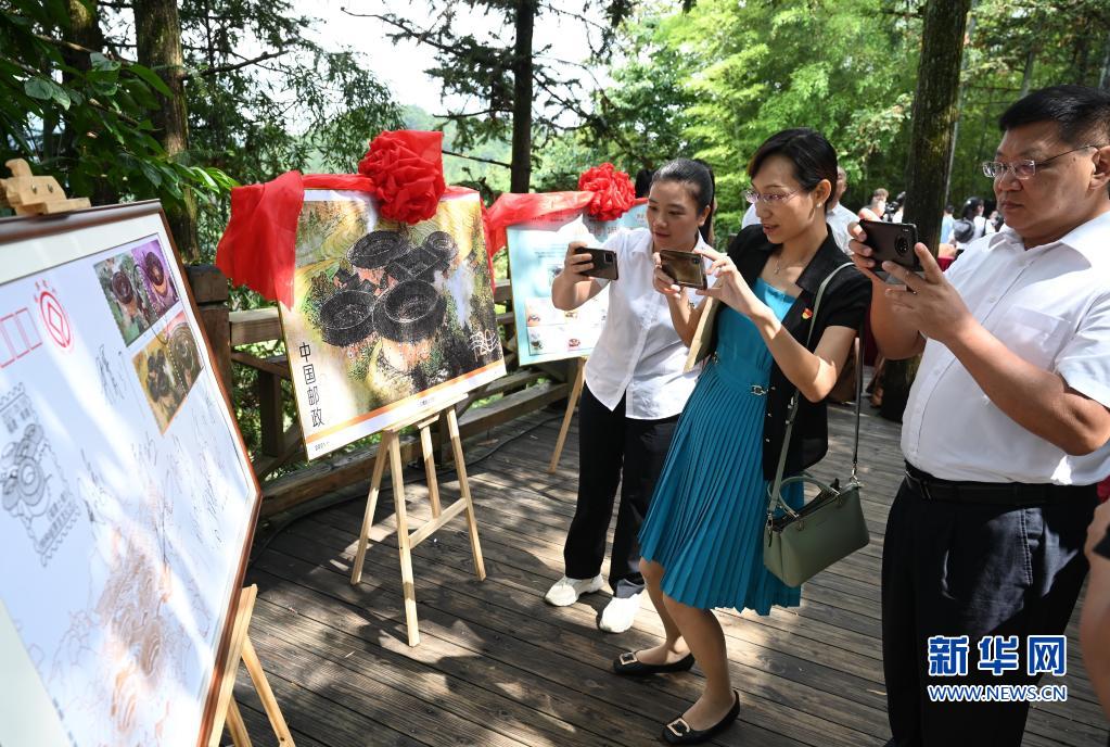 5月19日,在福建漳州市南靖縣田螺坑土樓群觀景臺,參觀者在《福建土樓》特種郵票發行活動現場拍照。新華社記者 林善傳 攝