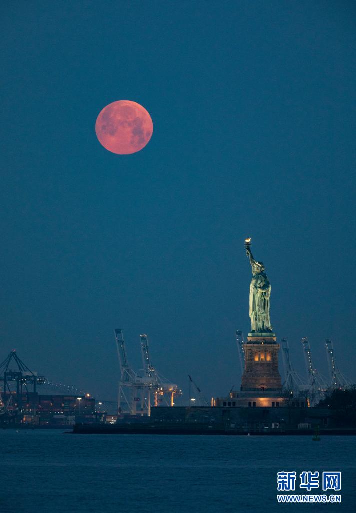 5月26日,在美國紐約,一輪圓月出現在自由女神像上方的天空。