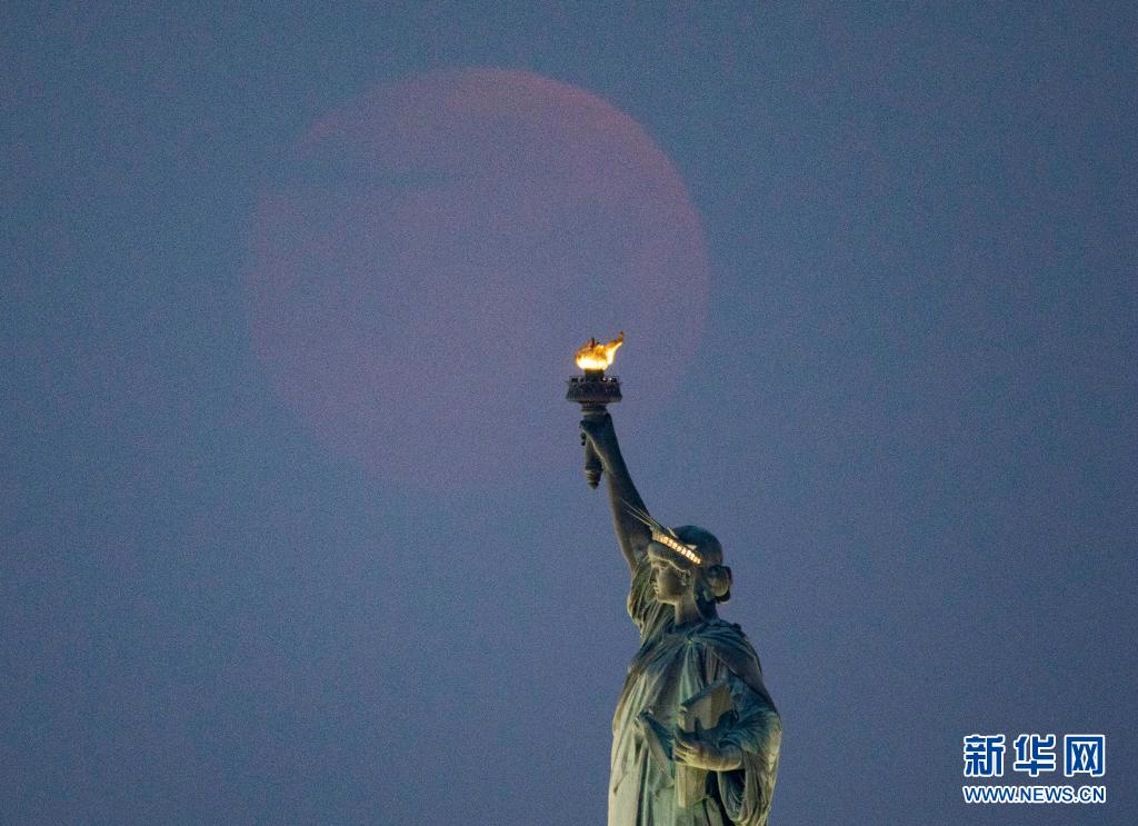 5月26日,在美國紐約,一輪圓月出現(xiàn)在自由女神像上方的天空。