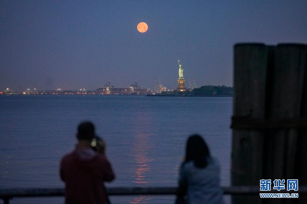 5月26日,在美國紐約,一輪圓月出現在自由女神像上方的天空。