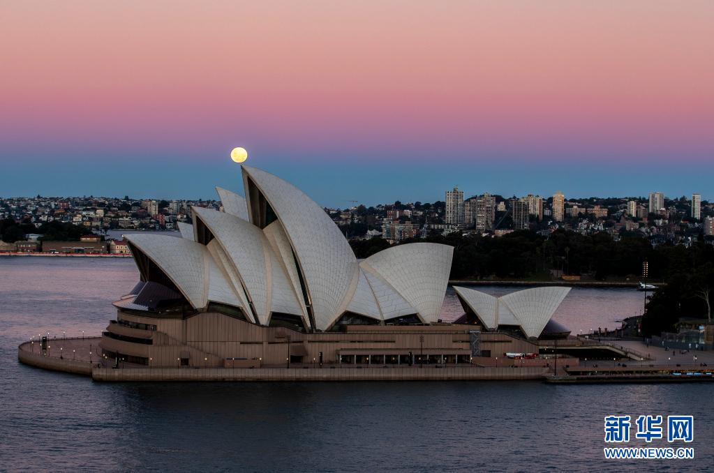 這是5月26日拍攝的澳大利亞悉尼歌劇院和剛剛升起的超級月亮。