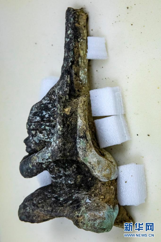 這是5月30日在四川德陽廣漢市三星堆遺址拍攝的從4號“祭祀坑”中提取出的青銅扭頭跪坐人像。