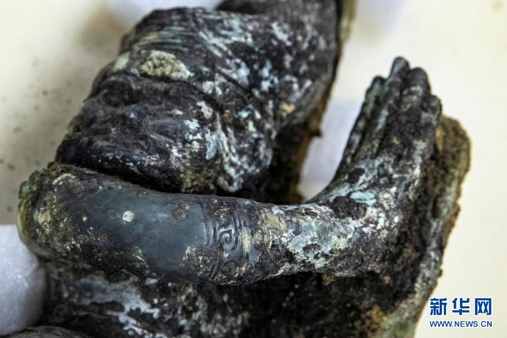 這是5月30日在四川德陽廣漢市三星堆遺址拍攝的從4號“祭祀坑”中提取出的青銅扭頭跪坐人像。