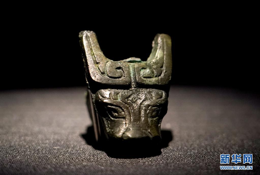 6月7日在奉賢博物館展廳拍攝的四川成都金沙遺址博物館藏文物“銅牛首”。