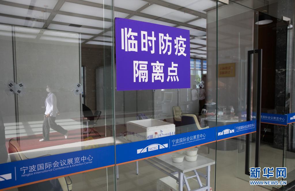 6月9日在寧波國際會議展覽中心拍攝的入口處的臨時防疫隔離點。
