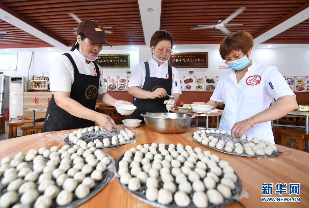 6月11日,在福建三明市沙縣區,阿蓮豆腐丸技藝傳承人黃秀蓮(中)和同事一起制作滾粉豆腐丸。