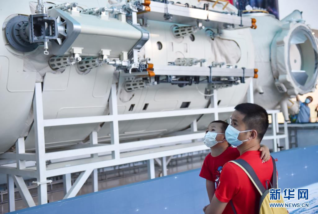 6月19日,一名家長帶著孩子來到位于北京市朝陽區的中國科學技術館,參觀“天和核心艙”結構驗證件實物,了解中國空間站相關知識。新華社記者 陳鐘昊 攝