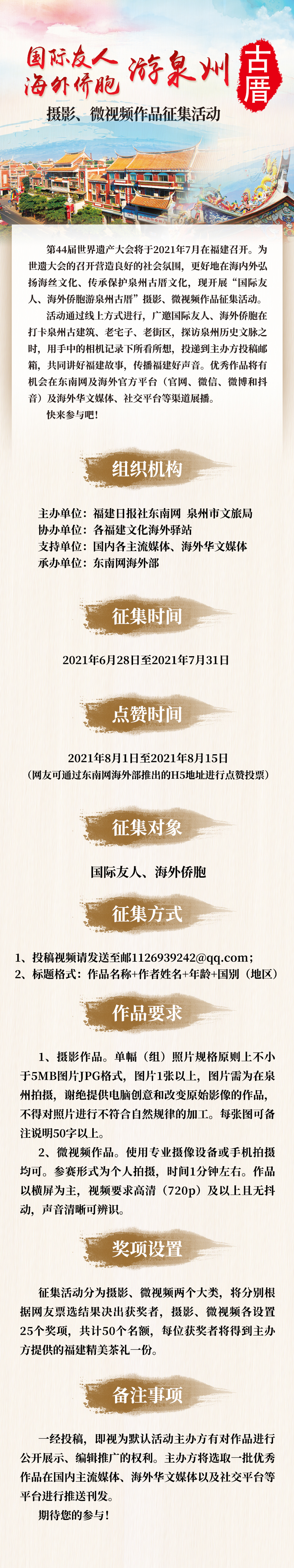 東南網7月27日訊(本網記者 王文青)為更好地在海內外弘揚海絲文化、傳承保護泉州文化,7月26日,由福建日報社東南網、泉州市人民政府外事辦公室、泉州市文化和旅游局、泉州市歸國華僑聯合會、泉州市對外文化交流協會聯合主辦,東南網海外部、泉州站承辦的“國際友人、海外僑胞游世遺泉州”攝影、微視頻作品征集活動正式啟動。 活動通過線上方式進行,征集時間為期一個月,廣邀請國際友人、海外僑胞在打卡泉州景點、美食等,探訪泉州歷史文脈之時,用自己手中的相機記錄所看所想,共同講好福建故事,傳播福建好聲音。相關作品均可以“作品名稱+作者姓名+年齡+國別(地區)”命名,并發送至投稿郵箱1126939242@qq.com。 活動征集分攝影、微視頻兩大類,各設置25個獎項,共計50個獲獎名額。所有參與活動的作品均將通過網絡進行展示,經網友投票評選出獲獎作品后,每位獲獎者都將得到主辦方提供的福建精美茶禮一份。優秀作品還將有機會在東南網海(境)外頻道及海外華文媒體、社交平臺等渠道進行展播,期待您的參與!