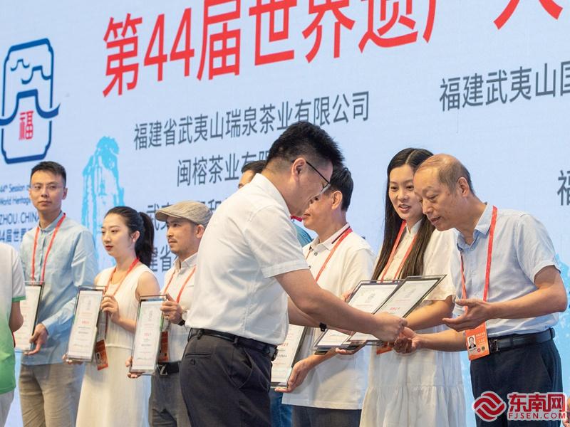 福州茉莉花茶窨制工藝非遺傳承人、閩榕茶業(yè)董事長(zhǎng)王德星(右一)獲頒世遺大會(huì)“接待用茶贊助企業(yè)”證書 嚴(yán)錦華供圖