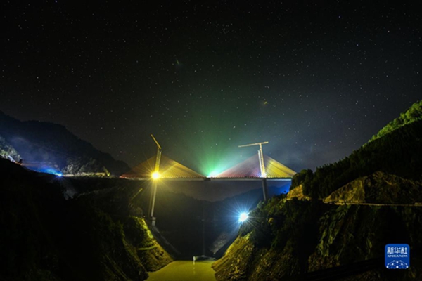 這是2020年4月28日凌晨拍攝的貴州劍榕高速公路清水江特大橋建設場景。