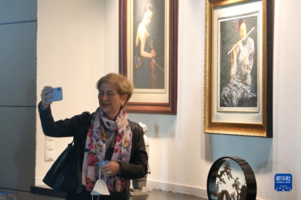 10月14日,觀眾在土耳其首都安卡拉那澤姆·希克梅特文化中心的中國絲綢刺繡展上自拍。