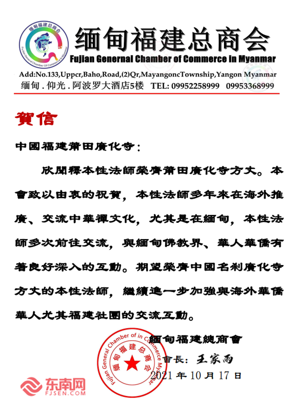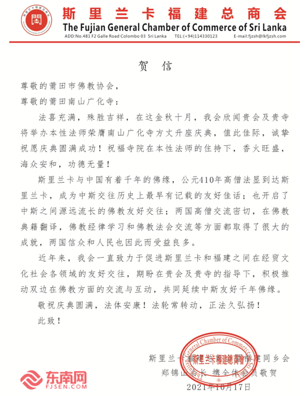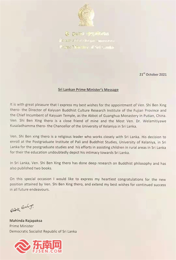 斯里蘭卡總理馬欣達(dá)·拉賈帕克薩專此發(fā)來賀信。 境外閩籍社團(tuán)賀信: